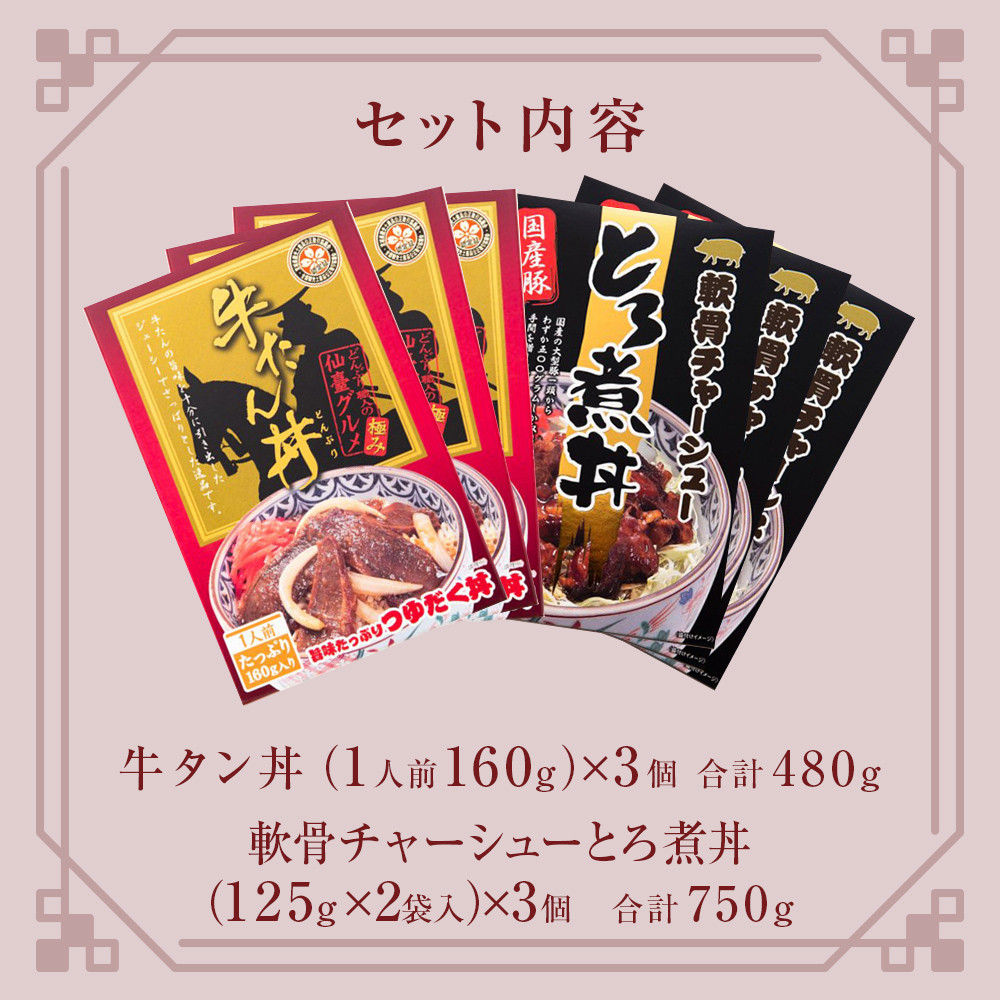 牛たん&豚軟骨のドンドン丼ぶりセット 牛タン丼と軟骨チャーシューとろ煮丼 各3個セット (各1~3個ずつ)常温 レトルト 丼の素 どんぶり 宮城県 石巻市