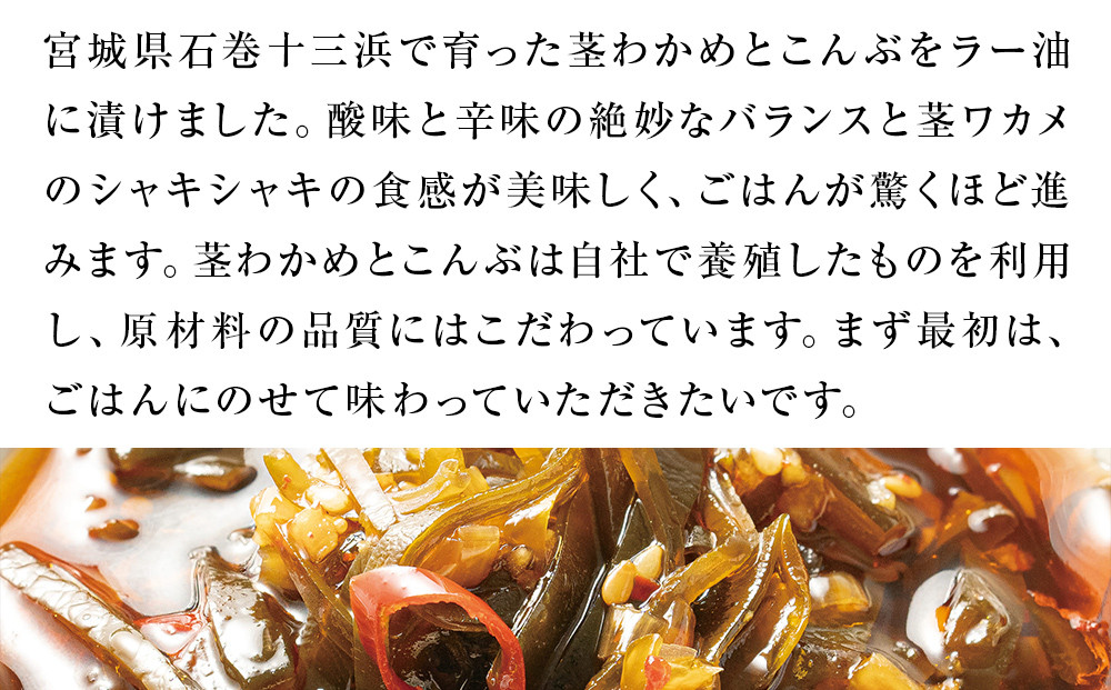 宮城県石巻十三浜で育った茎わかめとこんぶをラー油に漬けました。酸味と辛味の絶妙なバランスと茎ワカメのシャキシャキの食感が美味しく、ごはんが驚くほど進みます。茎わかめとこんぶは自社で養殖したものを利用し、原材料の品質にはこだわっています。