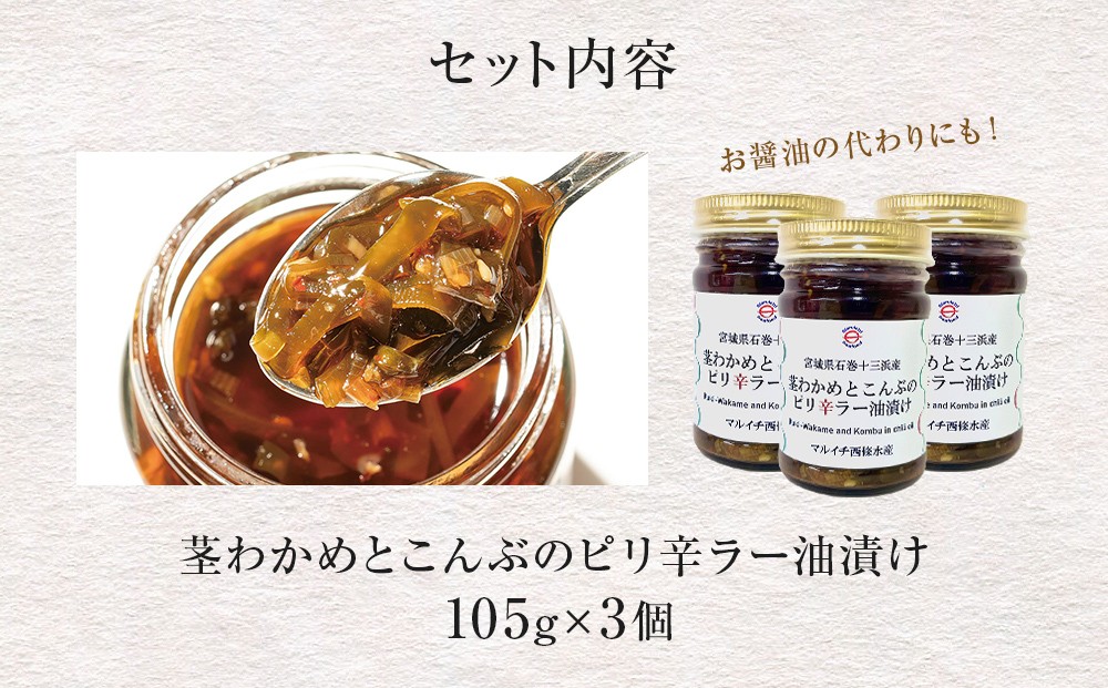 旨味ある海藻がピリリと刺激的なご飯のお供に! 茎わかめとこんぶのピリ辛ラー油漬け 3個セット
