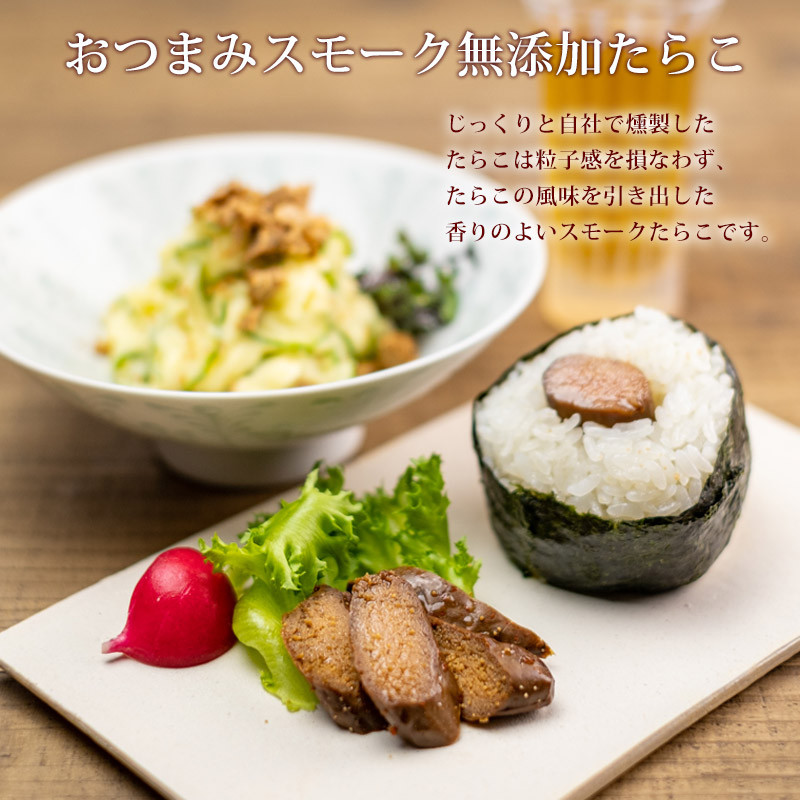 おつまみスモークたらこは1本づつ優しく丁寧に手漬けしたたらこを桜チップで燻製にし、食べやすいようにカットしました。香りも食感も程よく仕上げてますので、お酒にパスタにサラダにと、つまみにもおかずにもなる美味しさです。