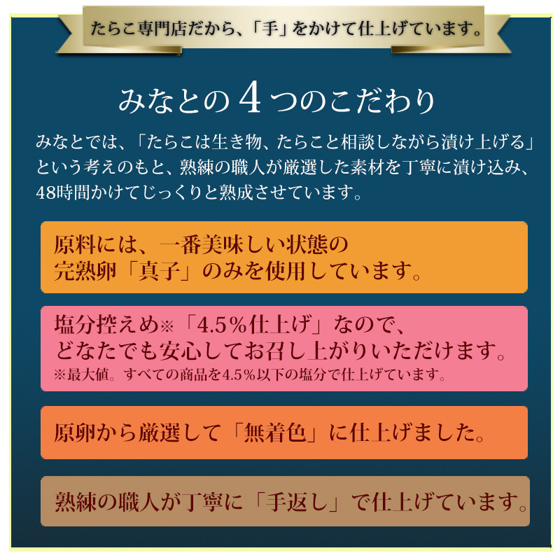 大切な人に味わって欲しいから、みなとは無添加無着色にこだわりました。自然素材の出汁と厳選した魚醤の旨味が、たらこ本来の味を引き立てます。