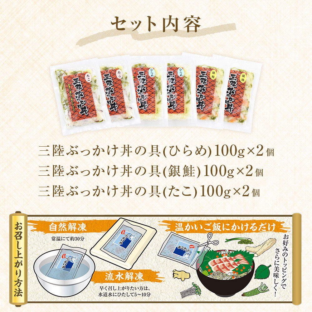 | 容量 | 三陸ぶっかけ丼の具(ひらめ)100g×2pc 三陸ぶっかけ丼の具(銀鮭)100g×2pc 三陸ぶっかけ丼の具(たこ)100g×2pc 【原材料】 三陸ぶっかけ丼の具(ひらめ) 三陸南部沖 三陸ぶっかけ丼の具(銀鮭)宮城県 三陸ぶっかけ丼の具(たこ)三陸北部 |