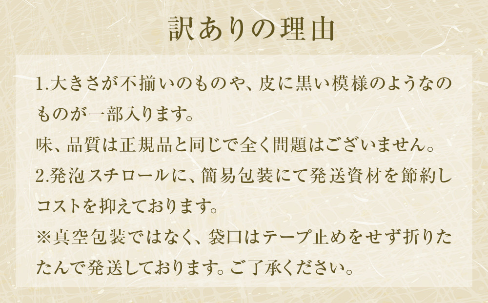 サイズが不揃いや、皮に黒い模様が見られることがありますが、味・品質は正規品と同じです。