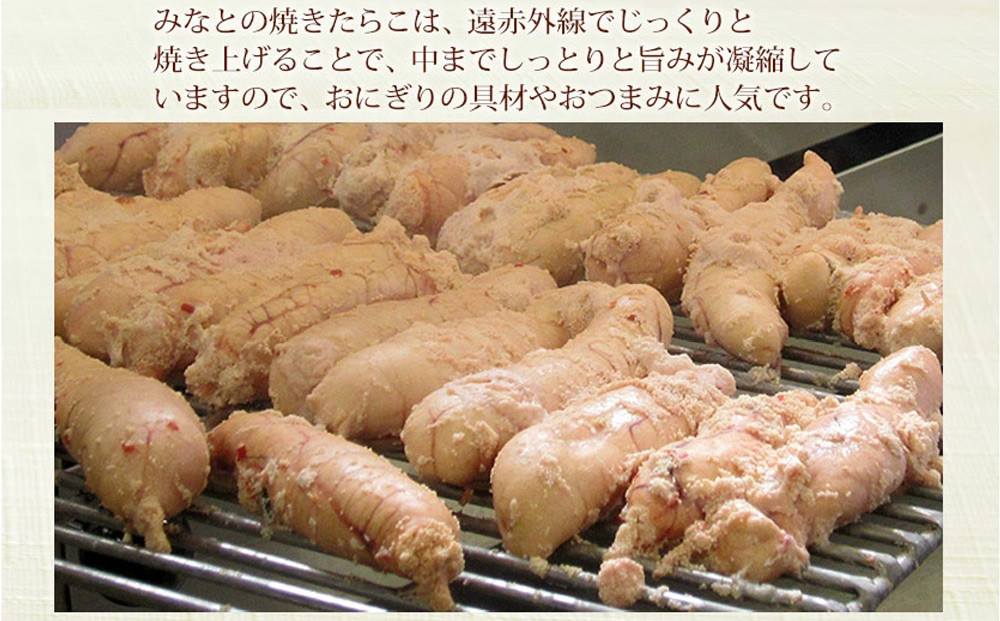 創業から一貫して「無着色」にこだわり続けてきたみなとのたらこは、熟成のたらこ職人が厳選した、原卵自体の色がきれいで、粒子がしっかりしている真子(完熟卵)のみを使用。創業以来守り続けている、手間のかかる「手漬け方式」でひと腹ひと腹丁寧に仕上げています。明太子はたらこ本来の旨みを引き出すためにあえて辛さを抑えているため、お子様や辛さが苦手な方にも大変喜ばれております。遠赤外線でしっとり仕上げてました。ごはんのおかずに、晩酌のおつまみにどうぞ。