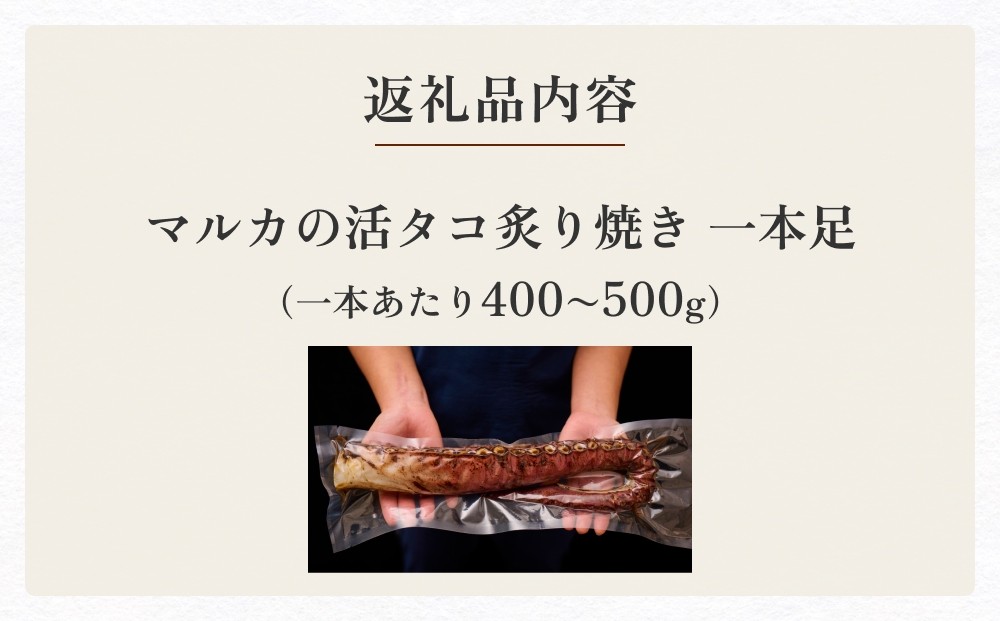 | 容量 | マルカの活タコ 炙り焼き 一本足(400〜500g) ※足の太さ・長さに個体差がございます。 ※表記の重量範囲内でお届けいたします。あらかじめご了承ください。 |