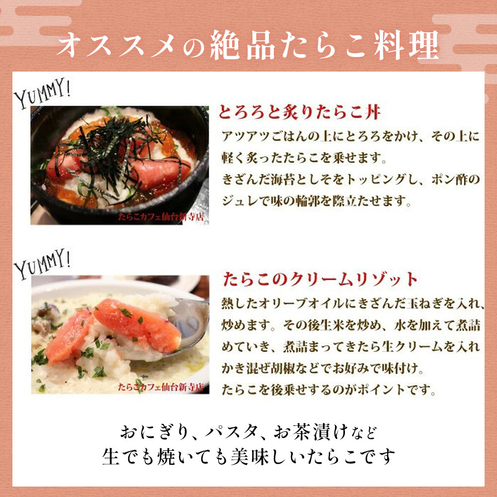 新鮮なスケトウダラの卵を使用し、職人の手で一腹ずつ丁寧に仕上げました。