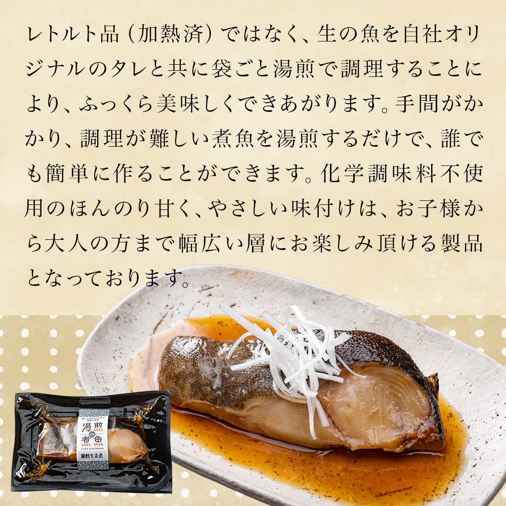 レトルト品(加熱済)ではなく、生の魚を自社オリジナルのタレと共に袋ごと湯煎で調理することにより、ふっくら美味しくできあがります。手間がかかり、調理が難しい煮魚を湯煎するだけで、誰でも簡単に作ることができます。化学調味料不使用のほんのり甘く、やさしい味付けは、お子様から大人の方まで幅広い層にお楽しみ頂ける製品となっております。