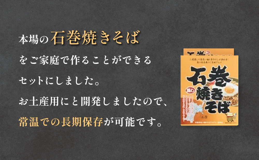 本場の石巻焼きそばをご家庭で作ることができるセットにしました。お土産用にと開発しましたので、常温での長期保存が可能です。 石巻焼きそばは、宮城県石巻市のご当地グルメです。特徴的なのは、蒸し麺を使用していることと、出汁で焼くスタイルです。地元石巻の食堂でよく作られている焼きそばです。
