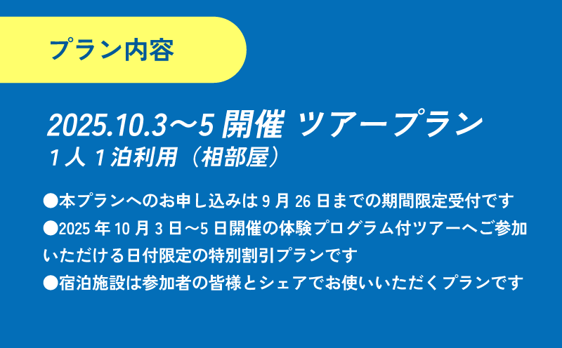・2025年10月3日〜5日開催の体験プログラム付ツアーへご参加いただける日付限定の特別割引プランです