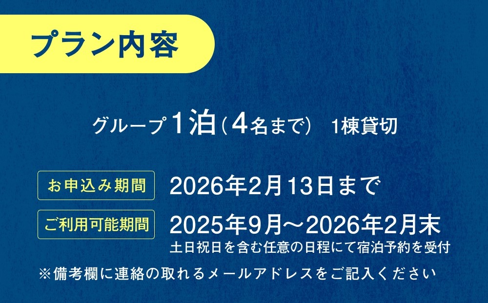 | 容量 | ・グループ1泊(4名まで)一棟貸切 |
