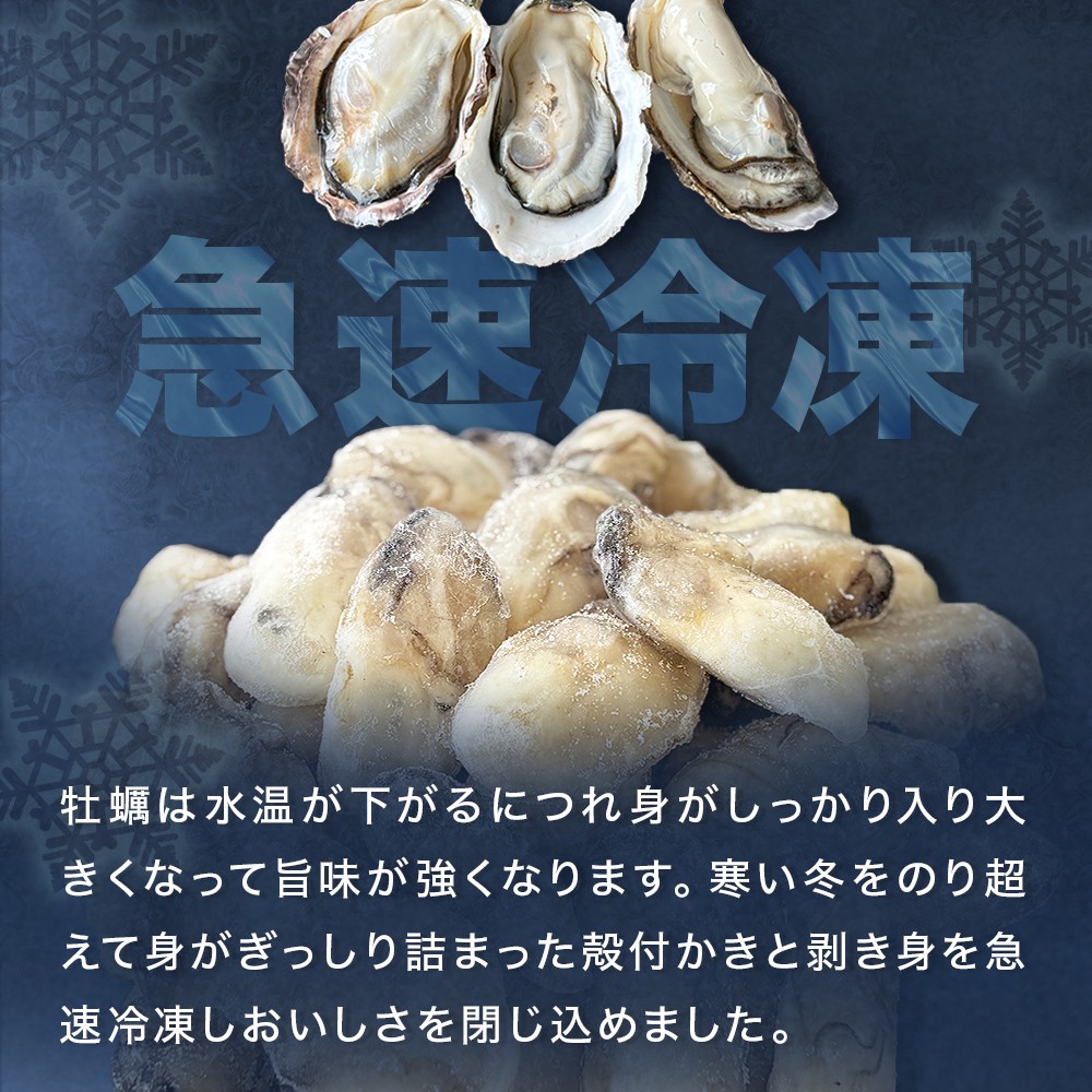 牡蠣は水温が下がるにつれ身がしっかり入り大きくなって旨味が強くなります。寒い冬をのり超えて身がぎっしり詰まった殻付かきと剥き身を急速冷凍しおいしさを閉じ込めました。