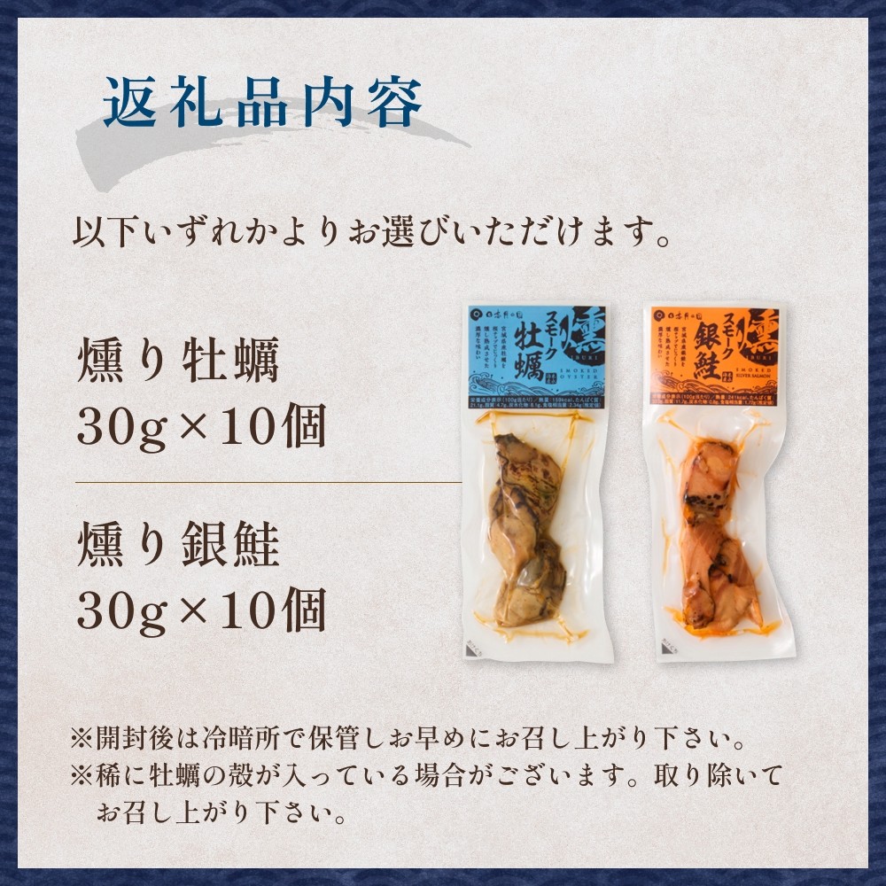 熟成に熟成を重ねた牡蠣の燻製・3日かけて熟成したスモーク銀鮭 スモーク牡蠣 または 銀鮭【燻製】10個 セット 燻製 牡蠣 かき カキ 銀鮭 さけ 鮭 しゃけ スモーク 燻り 海鮮 魚介 魚介類 おつまみ 晩酌 おかず 宮城県 石巻市