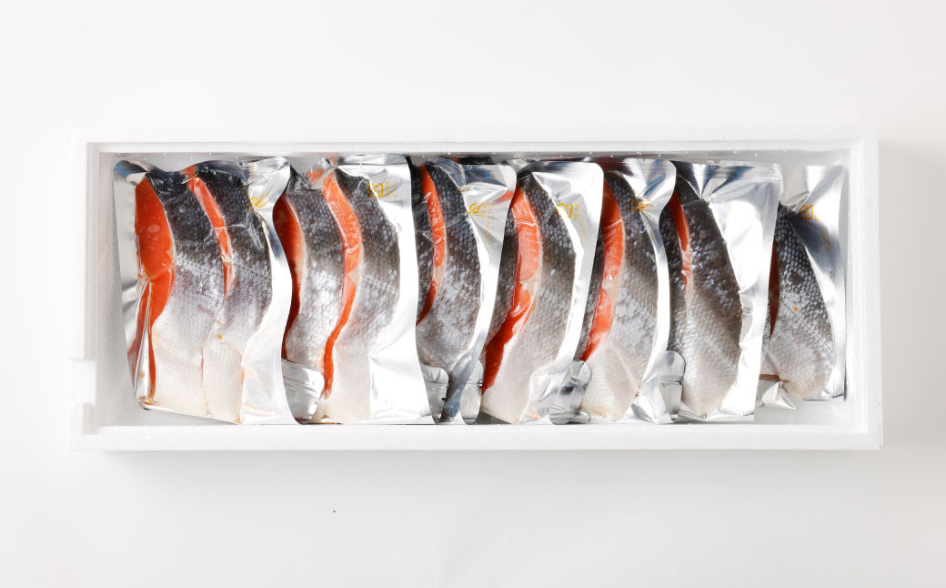 塩分を定めて、どの部分を食べても塩加減はほぼ同じに創りあげた紅鮭です。