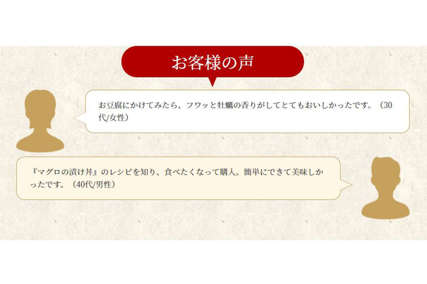 濃厚でクリーミーな完熟牡蠣の味わいを丸ごとエキスにして作ったオイスターソース。和洋中問わず、いろいろな料理に幅広く使え、その深くまろやかなコクでいつもの料理をワンランクアップさせてくれます。気仙沼の海と人の魅力が詰まった深みとコクの万能調味料としてお土産にも人気です。第24回全国水産加工品総合品質審査会 農林水産大臣賞。 気仙沼・唐桑の生産者が手間暇と愛情掛けて育てる3~5月下旬のもまれ牡蠣だけを使用。夏にかけての温湯処理を終え冬を越えたこの時期の牡蠣は、産卵を前に栄養をたっぷり蓄えた大粒の身に、味も最も濃厚でミルキー。まさに「完熟」です。 *温湯処理とは…60度前後のお湯を焚き、クレーンで吊るした牡蠣の連を数分つけておくことで、牡蠣以外の生物を駆除する。牡蠣に付着した同じ植物プランクトンを餌とする生き物が外れるので、牡蠣にとってはたっぷりと植物プランクトンを食することができるので身の入りが大変よくなる。 生産者さんが手塩にかけた牡蠣を余すところなく生かしたい-。牡蠣は剥いてすぐ凍結させ、天然酵素を使った特許製法で分解し丸ごとエキスにしています。濃厚でまろやか、他にない味を表現できました。 *製法特許取得済み 特願2015-107510 牡蠣のエキスの原液に、厳選した天然調味料を合わせてコクを出しています。牡蠣の味を生かし、化学調味料・保存料無添加。和、洋、中と様々なお料理にアレンジ自在です。