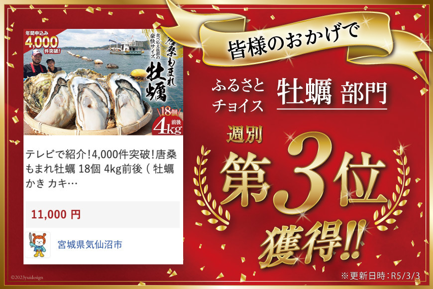 チョイスPayポイントと交換できる品 海の中にも三年!食べ応え抜群の豪快サイズ! 【期間限定発送】テレビで紹介!累計申込み14,000件突破!唐桑もまれ牡蠣 15個 約3kg [戸羽平 宮城県 気仙沼市 20563890] 牡蠣 かき カキ もまれかき 殻付き牡蠣