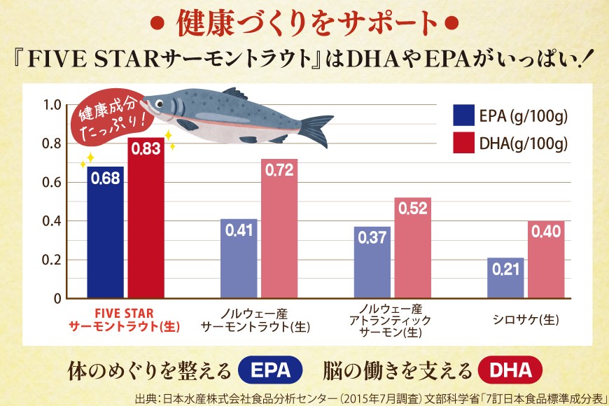 ニッスイ出資のグループ企業が生産を手掛けるサーモントラウトのトップブランド「FIVE STAR」を使用。