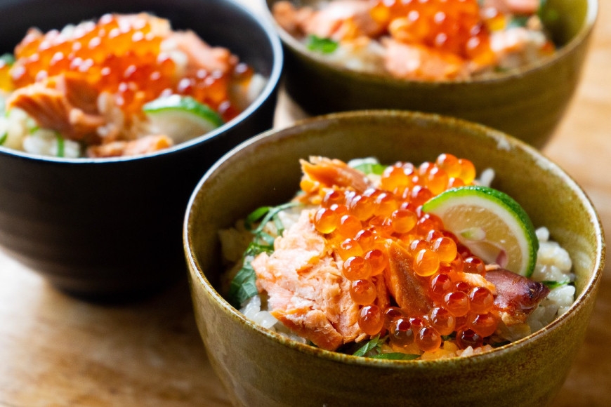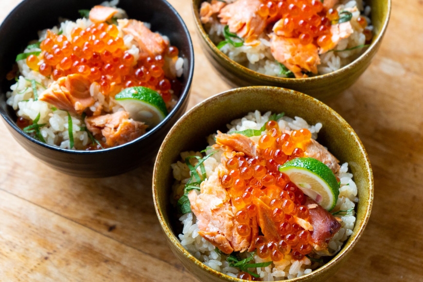 おだしで炊いたご飯と醤油の香りのするしっとりの銀鮭、いくらの醤油漬けが本当に良く合います。
