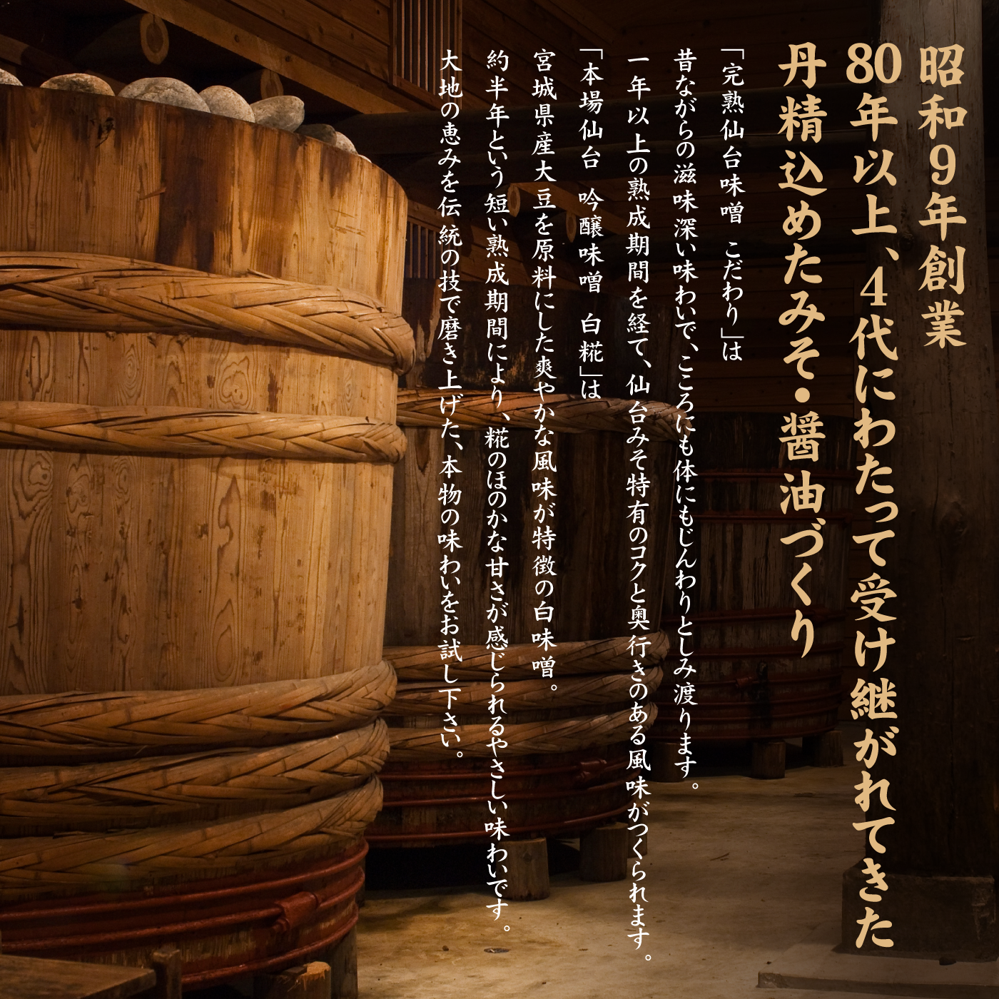 宮城県産大豆と宮城県産米を使用した、長期熟成「完熟味噌こだわり」。