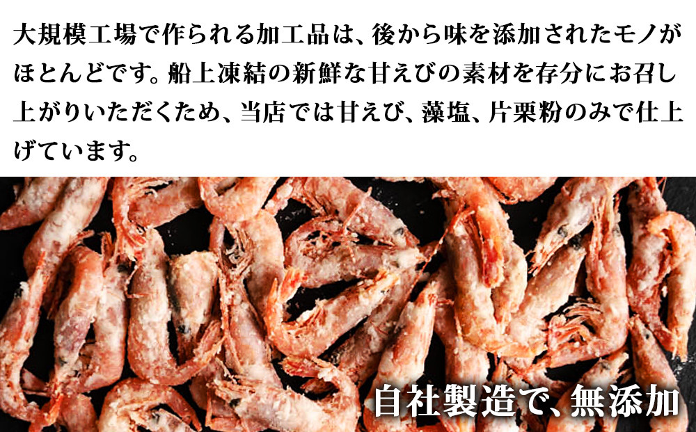 船上凍結の新鮮な甘えびの素材を存分にお召し上がりいただくため、当店では甘えび、藻塩、片栗粉のみで仕上げています。