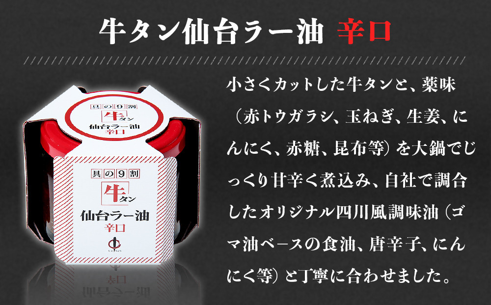 | 容量 | 牛タン仙台ラー油(100g):牛タン(カナダ、アイルランド、その他)、食用調合油(食用なたね油、食用大豆油)、砂糖、醤油、食用ごま油、オイスターソース、味噌、フライドガーリック、フライドオニオン、香辛料、干し椎茸、胡麻、唐辛子、さとうきび抽出物/調味料(アミノ酸)、トウガラシ色素、カラメル色素、(一部に小麦・牛肉・ごま・大豆を含む) 牛タン仙台ラー油【辛口】(100g):牛タン(カナダ、アメリカ、その他)、食用調合油(食用なたね油、食用大豆油)、砂糖、醤油、食用ごま油、オイスターソース、味噌、フライドガーリック、フライドオニオン、香辛料、干し椎茸、胡麻、唐辛子、さとうきび抽出物/調味料(アミノ酸)、トウガラシ色素、カラメル色素、(一部に小麦・牛肉・ごま・大豆を含む) 牛タン仙台オリーブ辛油(100g):牛タン(カナダ、アメリカ、その他)、食用オリ-ブオイル、たまねぎ、バルサミコ酢、食用こめ油、きざみにんにく、砂糖、カットオリーブ、トマトピューレ、香辛料、天日塩、アーモンド、牛タンエキス、フライドガーリック、さとうきび抽出物/pH調整剤、安定剤(増粘多糖類)、(一部にアーモンド・牛肉を含む) 牛タン生姜入り米油(100g):牛タン(カナダ、アメリカ、その他)、食用こめ油、ねぎ、生姜、てん菜糖、醤油、たまねぎ、牛タンエキス、米黒酢、昆布粉末、香辛料、天日塩、さとうきび抽出物/カラメル色素、安定剤(増粘多糖類)、調味料(アミノ酸等)、(一部に小麦・牛肉・大豆を含む) 牛タン仙台そぼろ(100g): 牛タン(カナダ、アメリカ、その他)、醤油、砂糖、粉末水あめ、みりん、ジンジャーペースト、食用ごま油、牛タンエキス、オニオンパウダー、さとうきび抽出物、塩麹、味噌、天日塩、椎茸エキス、オイスターソース、香辛料、昆布粉末、おろしにんにく/カラメル色素、pH調整剤、トレハロース、調味料(アミノ酸等)、増粘剤(キサンタン)、(一部に小麦・牛肉・ごま・大豆を含む) 仙台みそ南蛮(110g):青唐辛子味噌漬け(青唐辛子(中国)、食塩、その他)、味噌、砂糖、醤油、オイスターソース/トレハロース、カラメル色素、調味料(アミノ酸等)、(一部に小麦・ごま・大豆を含む) |