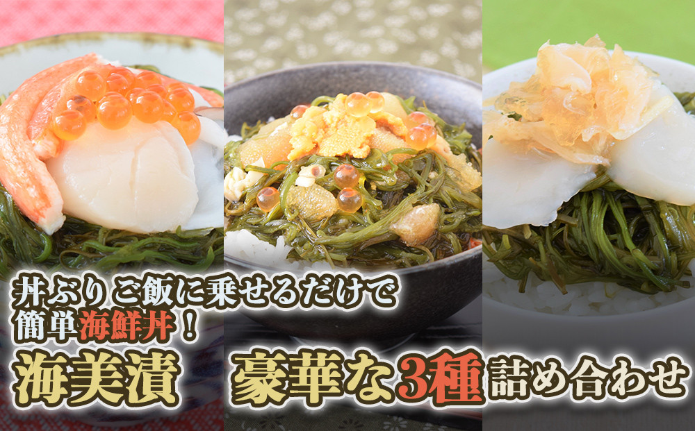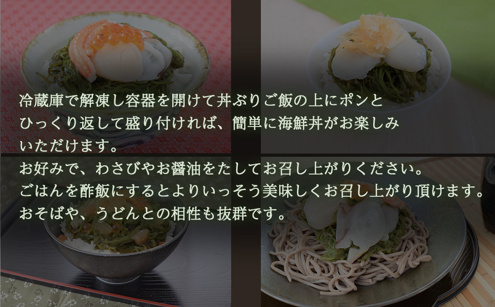 三陸産のめかぶをベースに、豪華な海鮮具材をトッピングした、海美漬(うみづけ)3種の海鮮丼セットです。