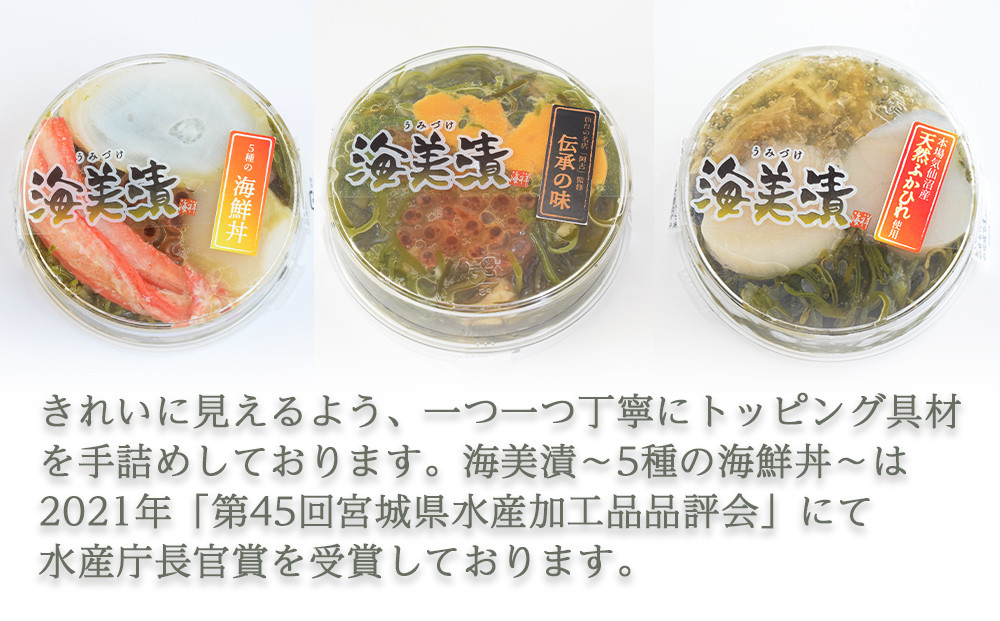 | 容量 | 海美漬~5種の海鮮丼~1食分×2個 海美漬~仙台の名店阿古監修伝承の味~1食分×2個 海美漬~本場気仙沼産ふかひれ使用~1食分×2個 |