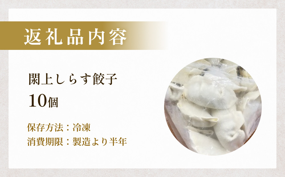 | 容量 | 餃子 10個 【原材料】 閖上しらす・キャベツ・豚肉・豚脂・生姜・塩・胡椒・青じそ・日本酒・ごま油 |