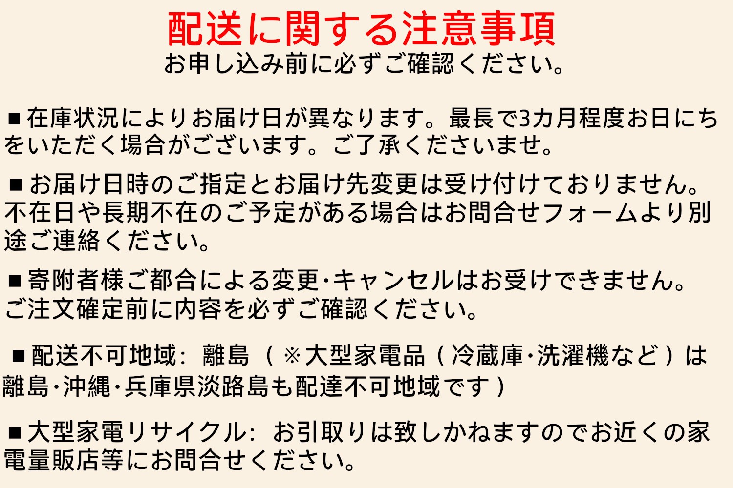 | 発送期日 | 入金確認後、約2週間~1カ月で発送。 ただし、季節家電、申込み多数やアイリスオーヤマ長期休業(年末年始、GW、お盆)の時期は、在庫状況により上記より時間を頂く場合がございます。 |