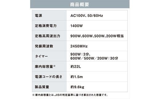 | 容量 | 【商品サイズ(約)】W495×D365×H302mm 【重量(約)】9.6kg 【製品仕様】 ■電源:AC100V ■定格周波数:50Hz/60Hz ■定格消費電力:1400W ■定格高周波出力:900W、600W、500W、200W相当 ■発振周波数:2450MHz ■庫内総容量:約22L ■加熱室有効サイズ:約W335×D332×H229mm ■タイマー:900W:3分、600W/500W/200W相当:30分 ■電子レンジ機能の年間消費電力量:60.1kWh/年 ■年間待機時消費電力量:0.0kWh/年 ■年間消費電力量:60.1kWh/年 ■電源コードの長さ:約1.5m |