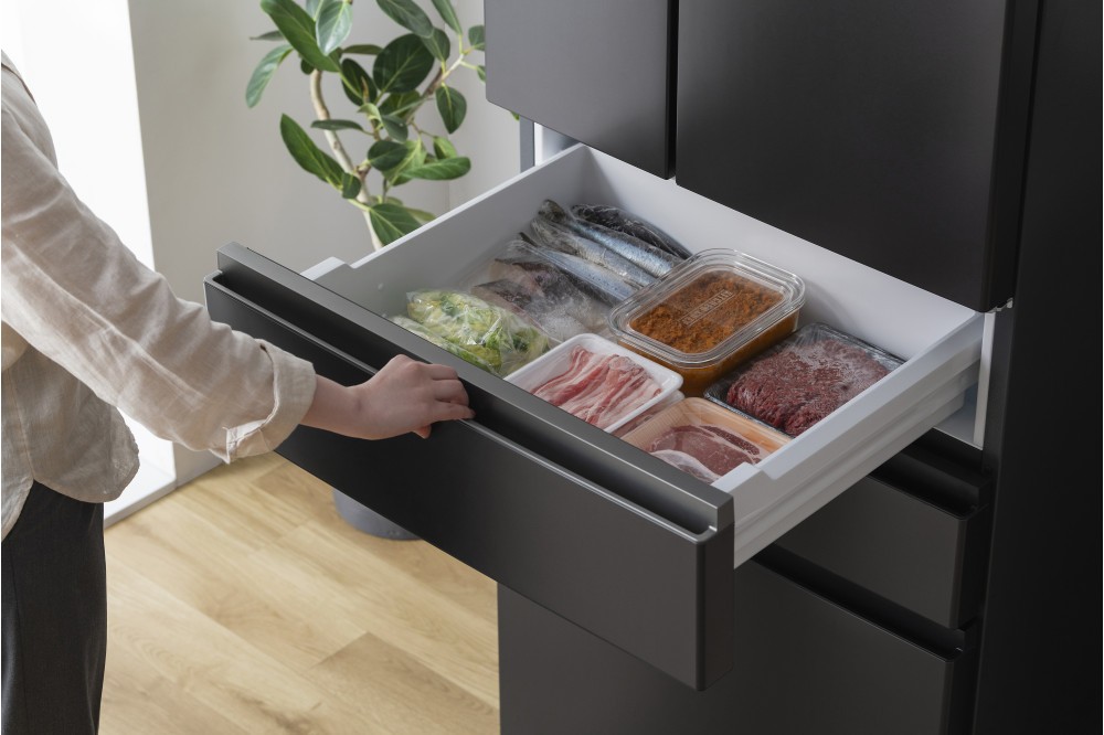 冷凍室下段にはトレイが3段、下段は冷凍食品を立てて収納できます。