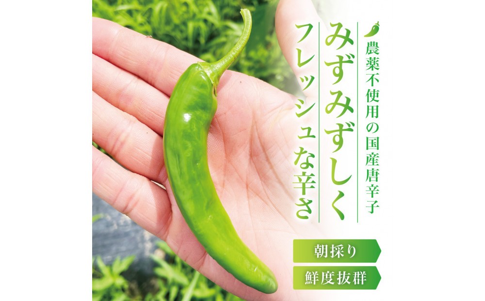 栽培期間中は農薬を使わず、手作業で除草するなど自然に近い環境で育てた安心安全な生の国産青唐辛子です。収穫当日に出荷するからこそ味わえる、みずみずしくフレッシュな辛さが特徴です。