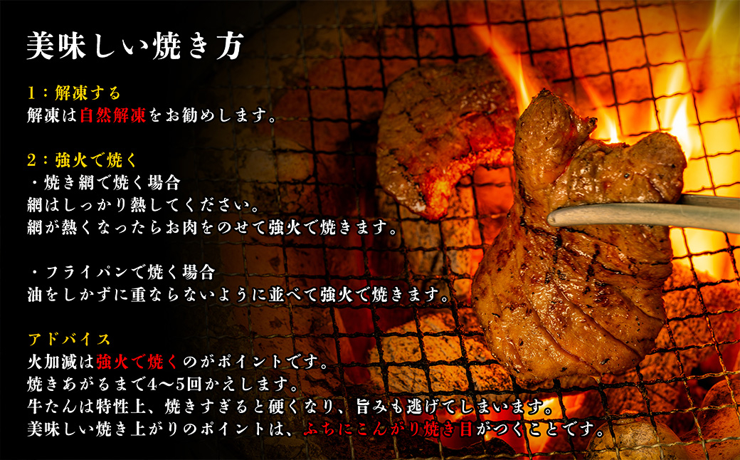 ミドル・タン元の良質の部位を使用し、職人の仕込みによる肉厚なのに「サクっ」と柔らかで歯切れの良い、肉汁たっぷりの噛むほどジューシーで食べ応えのある本場の特選牛タンです。真空パックでお届けしますので冷凍庫の場所も取らず、流水解凍で15~20分程度ですので夕食に急いで食べたい場合やキャンプなどのBBQにもおすすめです。