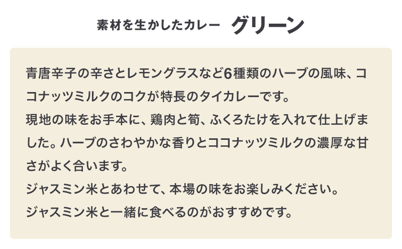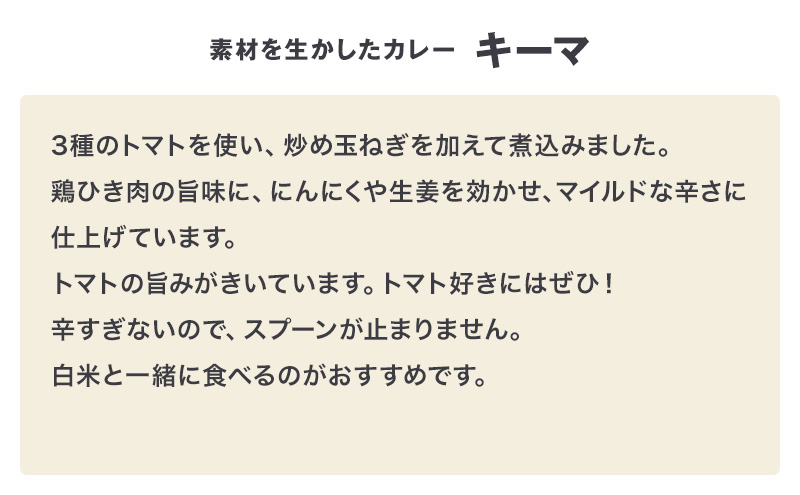 | 容量 | 素材を生かしたカレーバターチキン(6代目)3個 素材を生かしたカレーグリーン3個 素材を生かしたカレープラウンマサラ(海老のクリーミーカレー)2個 素材を生かしたカレーキーマ2個 合計10個 |
