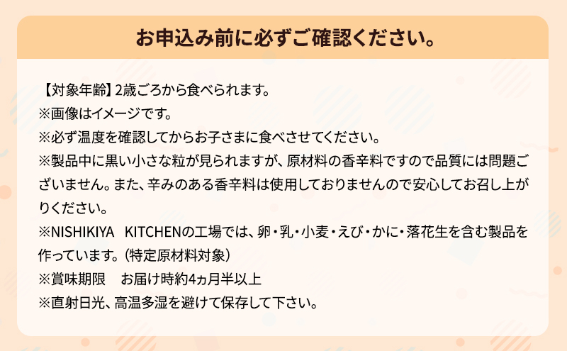 ※NISHIKIYA KITCHENの工場では、卵・乳・小麦・えび・かに・落花生を含む製品を作っています。(特定原材料対象) |