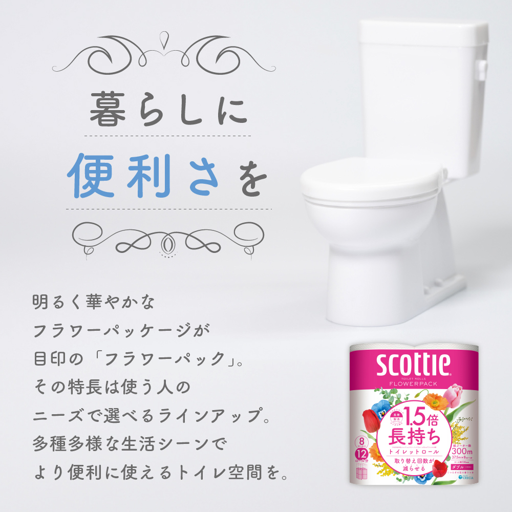 | 容量 | スコッティフラワーパック1.5倍巻き:ダブル37.5m(8ロール) 1ケース(4パック入り) ※ご入金確認後の翌月より、 6ヶ月に1回中旬頃に合計2回お届けいたします。 日本製・パルプ・香りつき |