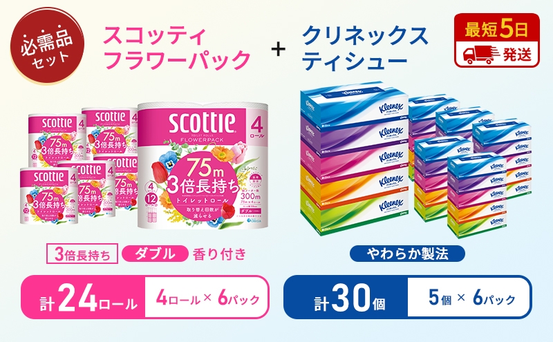【岩沼市オリジナル】ティッシュ クリネックス ティシュー 5箱入×6パック トイレットペーパー ダブル スコッティ3倍長持ち 4ロール×6パック フラワーパック 香り付き 長持ち 防災 災害 日用品 生活用品 生活必需品 [№5704-1780]