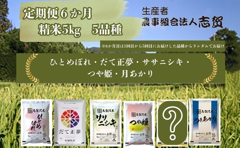 【訳アリ/令和7年産新米】米 定期便 6ヶ月 おまかせセット 5kg 志賀沢米 ひとめぼれ だて正夢 ササニシキ つや姫 つきあかり 6回目は品種おまかせ お米 白米 精米 ブランド米 5キロ ご飯 ライス 宮城 岩沼[№5704-1812]