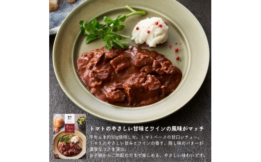 シチューはトマトベースの味付けで、トマトのやさしい甘味とワインの風味がマッチし、