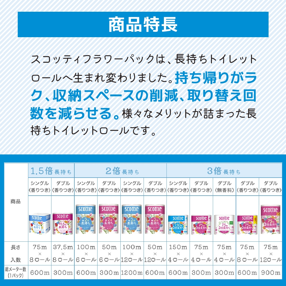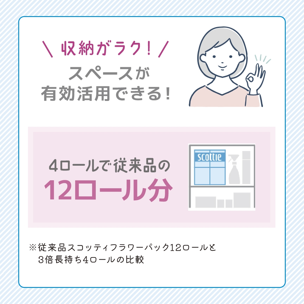 | 容量 | スコッティフラワーパック3倍長持ち:シングル 4ロール(150m×4ロール) 4ロール×1パック×3回お届け ※くつろぎの花の香りつき ※ご入金確認後の翌月より、4ヶ月に1回中旬頃に合計3回お届けいたします。 パルプ 日本製 |