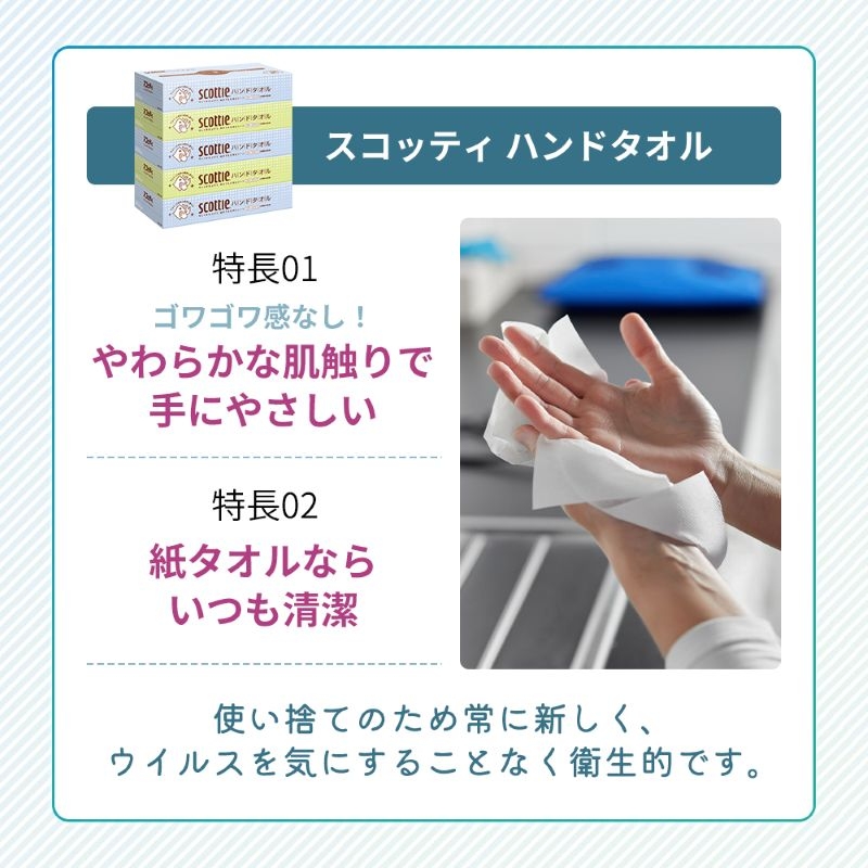 | 容量 | スコッティ キレイの仕上げハンドタオル200枚(100組) 5箱×2パック入り 高品質パルプ使用 日本製 |