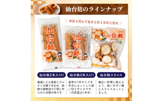 容量 | ▼仙台麸バラエティセット ・仙台麸2本入(大)×2袋 ・仙台麸2本入(小)BF×2袋 ・仙台麸スライス40g×3袋 ・仙台ふくちゃん(味噌味)×1袋 ・仙台ふくちゃん(南蛮味噌味)×1袋 |