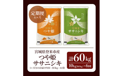 チョイスPayポイントと交換できる品 肥沃で広大な大地と北上川の清らかな水で育んだ登米市産のお米です。 ≪令和7年産≫【6回定期便】ササニシキ・つや姫 計60kg (各5kg×6回配送) 登米市産 お米 おこめ 米 コメ 白米 ご飯 ごはん おにぎり お弁当 6か月 頒布会【登米ライスサービス株式会社】tm462