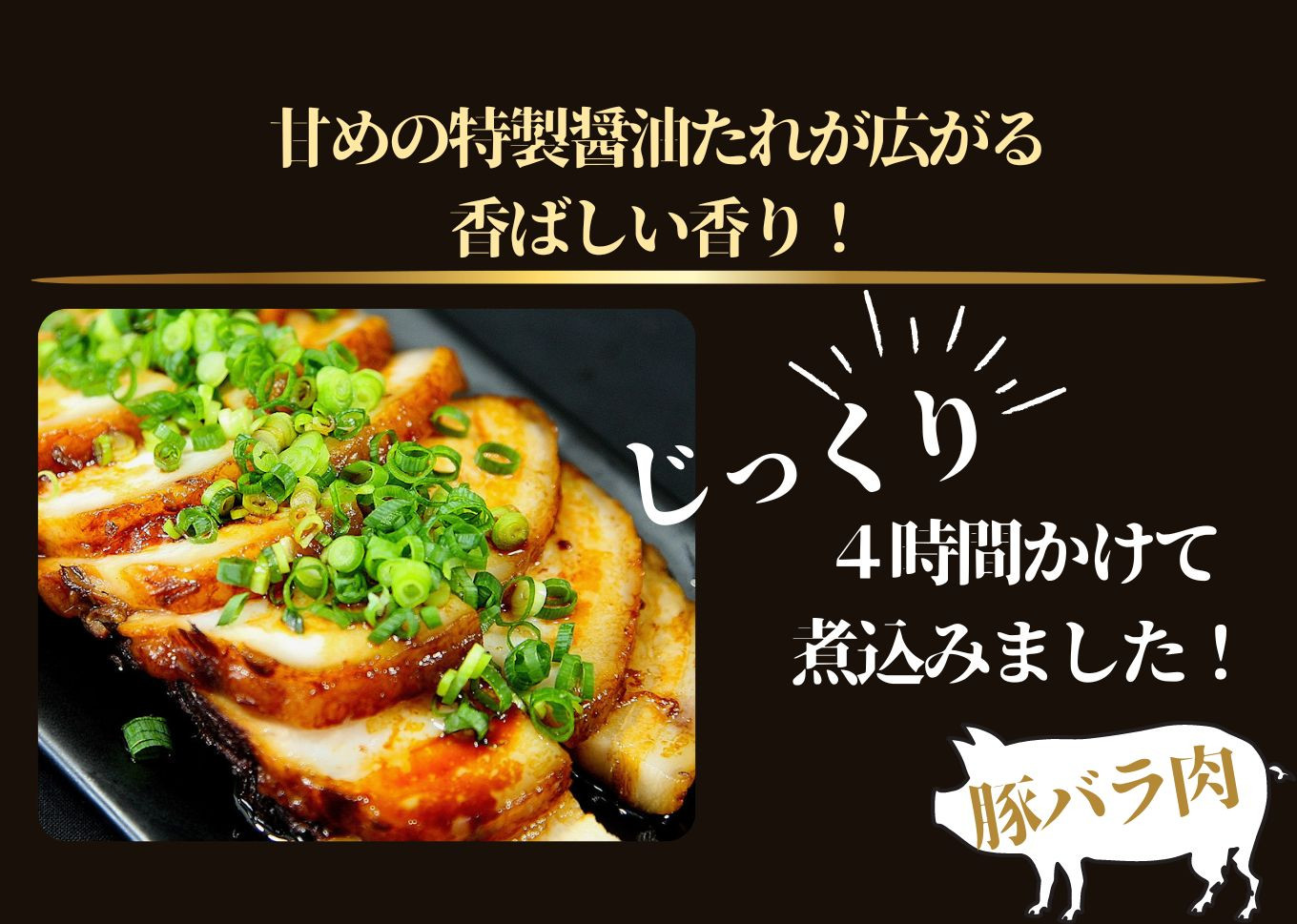 返礼品コード:075108 豚バラ肉を甘めの特製醤油たれでじっくり4時間かけて煮込んだ手作りチャーシューです。 広がる香ばしい香りに、肉質も柔らかく脂の旨みとタレのバランスが溶け合った逸品。