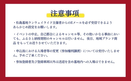 ※寄附入金確認後、2週間前後でEメールで参加申込み手続き(専用URL)を松島基地ランウェイライド主催者よりご案内いたします。 ※「松島基地ランウェイライド」大会参加規約に該当する内容により大会の中止、変更等が生じた場合でもふるさと納税寄附の取り消し、返金はできません。 |