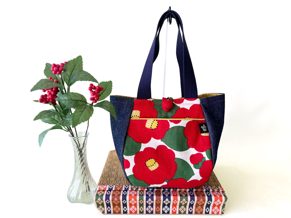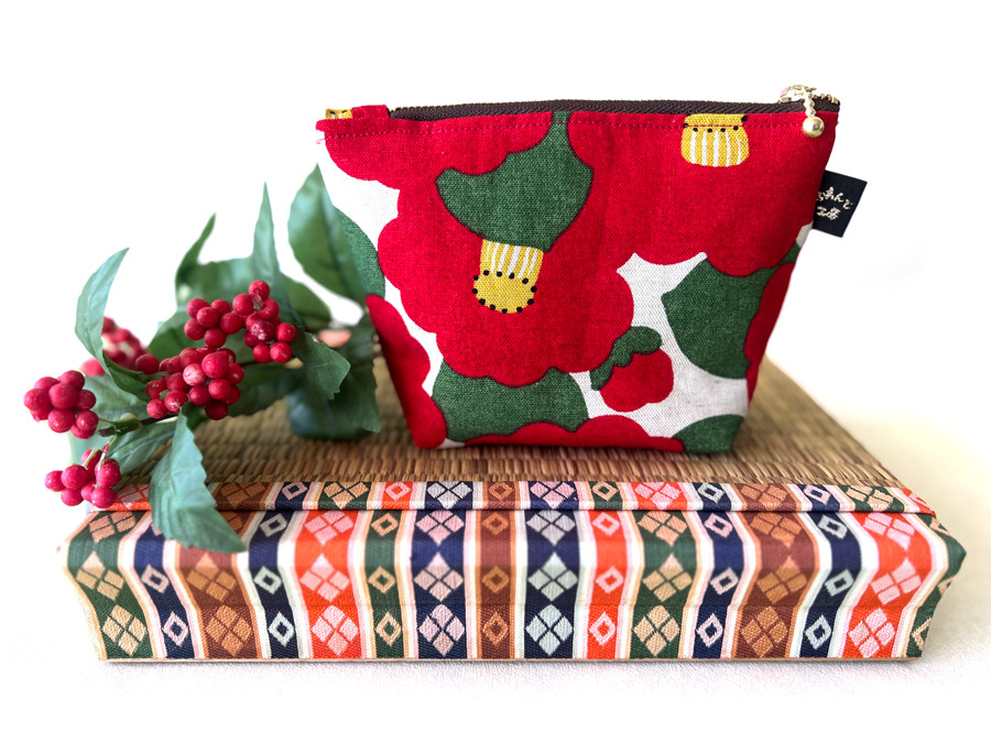 モダンレトロなつばき柄を用いた、ぷっくりバッグとファスナーポーチの2点セットです。