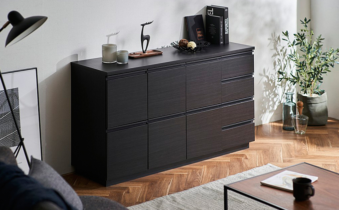 | 容量 | ●商品サイズ(約mm):W1190×D390×H720 ●引き出し内寸(約mm):W224×D336×H67 ●耐荷重:天板20kg、固定棚板・可動棚板(大)7kg/固定棚板・可動棚板(小)5kg、引出し(1個あたり)3kg ●カラー:ブラック |