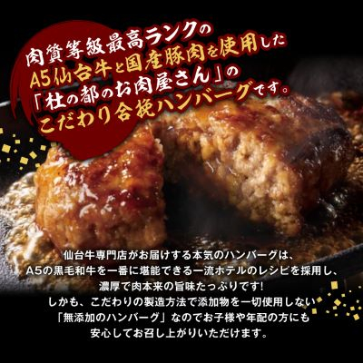 肉質等級最高ランクのA5仙台牛と国産豚肉を使用した「杜の都のお肉屋さん」こだわり合挽ハンバーグです。