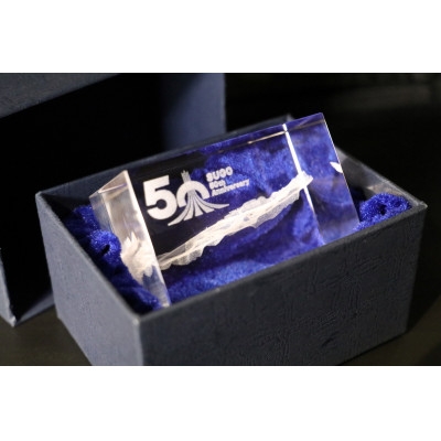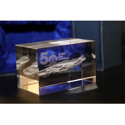 透明感のある美しいクリスタルは、光の角度によって様々な表情を見せ、飾る場所に華やかさを添えます。50周年のロゴと『SUGO 50th anniversary』の文字が刻まれた特別仕様で、記念品としても最適です。