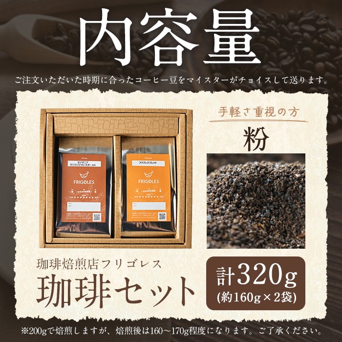 ご注文の時期に合ったコーヒー豆をマイスターがチョイスしてお送りする本格派コーヒー 珈琲焙煎店フリゴレス コーヒー豆のセット(粉) 2種 <計320g(約160g×2袋)> 珈琲 コーヒー パック 詰合せ 詰め合わせ 粉 焙煎 セット 【珈琲焙煎店フリゴレス】 sh034-A