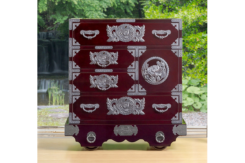 仙台箪笥の伝統スタイルを凝縮した愛らしいデザイン。 こちらの製品は、木地呂漆塗りが施してありコンパクトながら存在感のある箪笥です。 アクセント家具として、高い人気があり玄関ホールや床の間などにぴったりの箪笥となっております。 彫金手打金具は、厚さ1.0~2.5ミリの鉄板・銅板・真鍮板等を独自のタガネ数十本を使い分け、一つ一つ打ち出していきます。 さび止めや、いぶし、塗装の工程を経て豪華な金具飾りに仕上げられます。 ■ 宮城県 利府町 ■ 欅産業 仙台箪笥 タンス たんす 高級 工芸品 伝統
